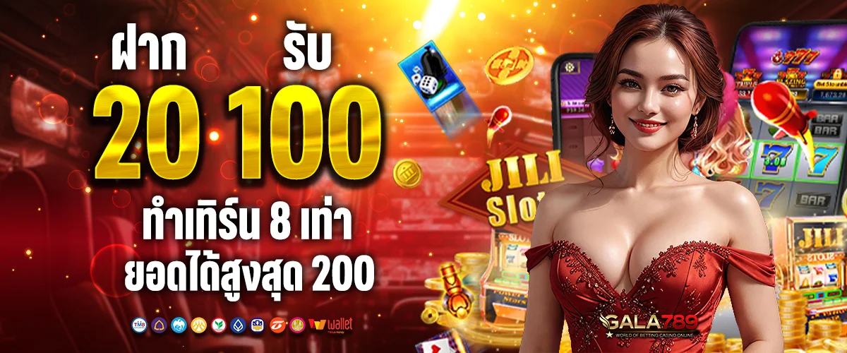 ฝาก 20 → รับเพิ่ม 80 = รวม 100 / ทำเทิร์น 8 เท่า / ถอนได้สูงสุด 200